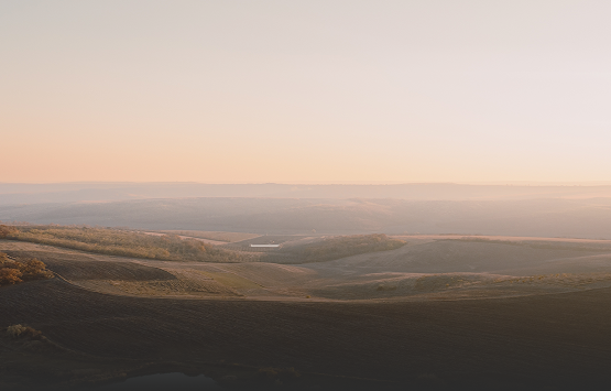 This photo captures a serene rural landscape at sunset, featuring rolling hills, golden fields, and a calm reflective pond.